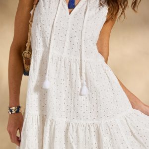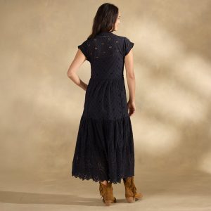 A sweeping statement dress with multiple tiers. lush embroidery. button-front. V-neck and short sleeves. Cotton. Dry clean. Imported. Sundance exclusive. Sizes XS (4). S (6). M (8?C10). L (12). XL (14). XXL (16). Approx. 50.5l.