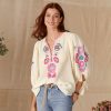 So stylish. our easy notch neckline top features feminine flutter sleeves with ladder lace insets. three buttons at the placket. special embroidery detail and ruffles at the neckline. Cotton. Hand wash. Imported. Sizes XS (0–2). S (4–6). M (8–10). L (12–14). XL (16–18). XXL (20–22). Approx. 23.75l.