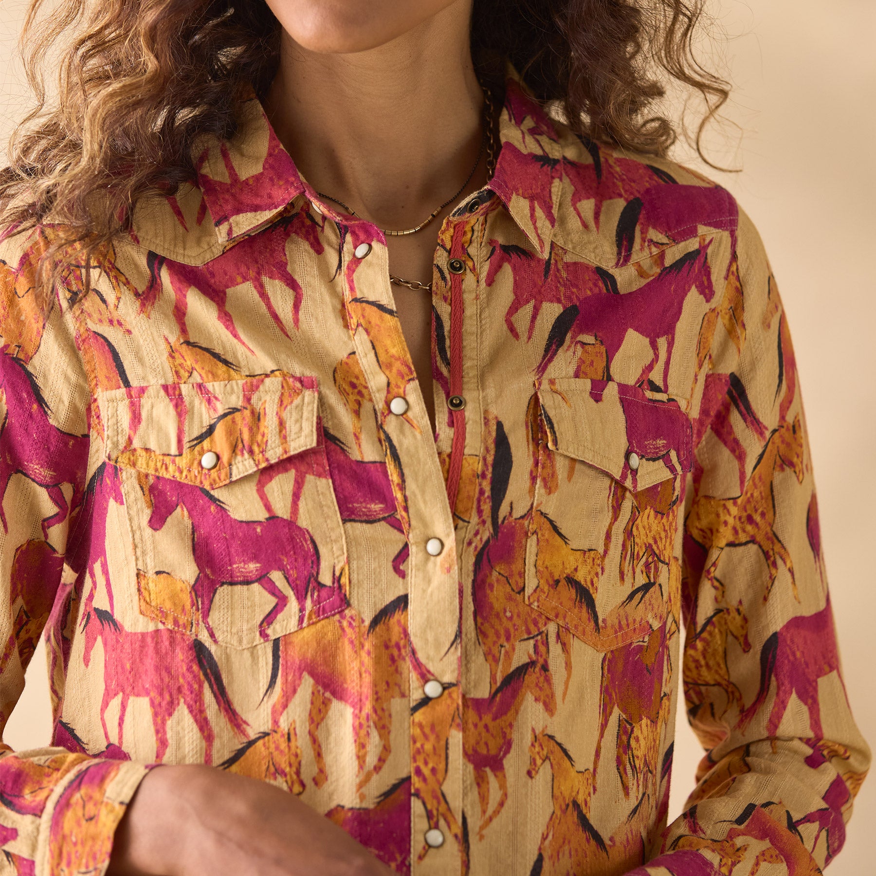 Western-inspired. pearlized snap front shirt in the prettiest cotton dobby with equestrian print. Two chest pockets. lace detail at back neck. grosgrain ribbon at placket. Western back yoke and shirttail hem. Machine wash. Imported. Exclusive. Sizes XXS (00). XS (0–2). S (4–6). M (8–10). L (12–14). XL (16–18). Approx. 25l.