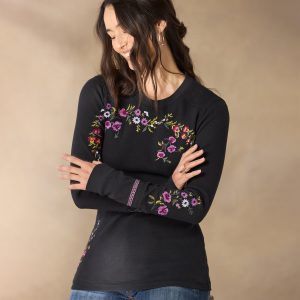 A Sundance classic body in new floral embroidery. our comfortable crewneck thermal boasts wide cuffs accented with velvet trim detail and metal buttons. Cotton/spandex. Machine wash. Imported. Exclusive. Sizes XXS (00). XS (0?C2). S (4?C6). M (8?C10). L (12?C14). XL (16?C18). Approx. 23.5l.