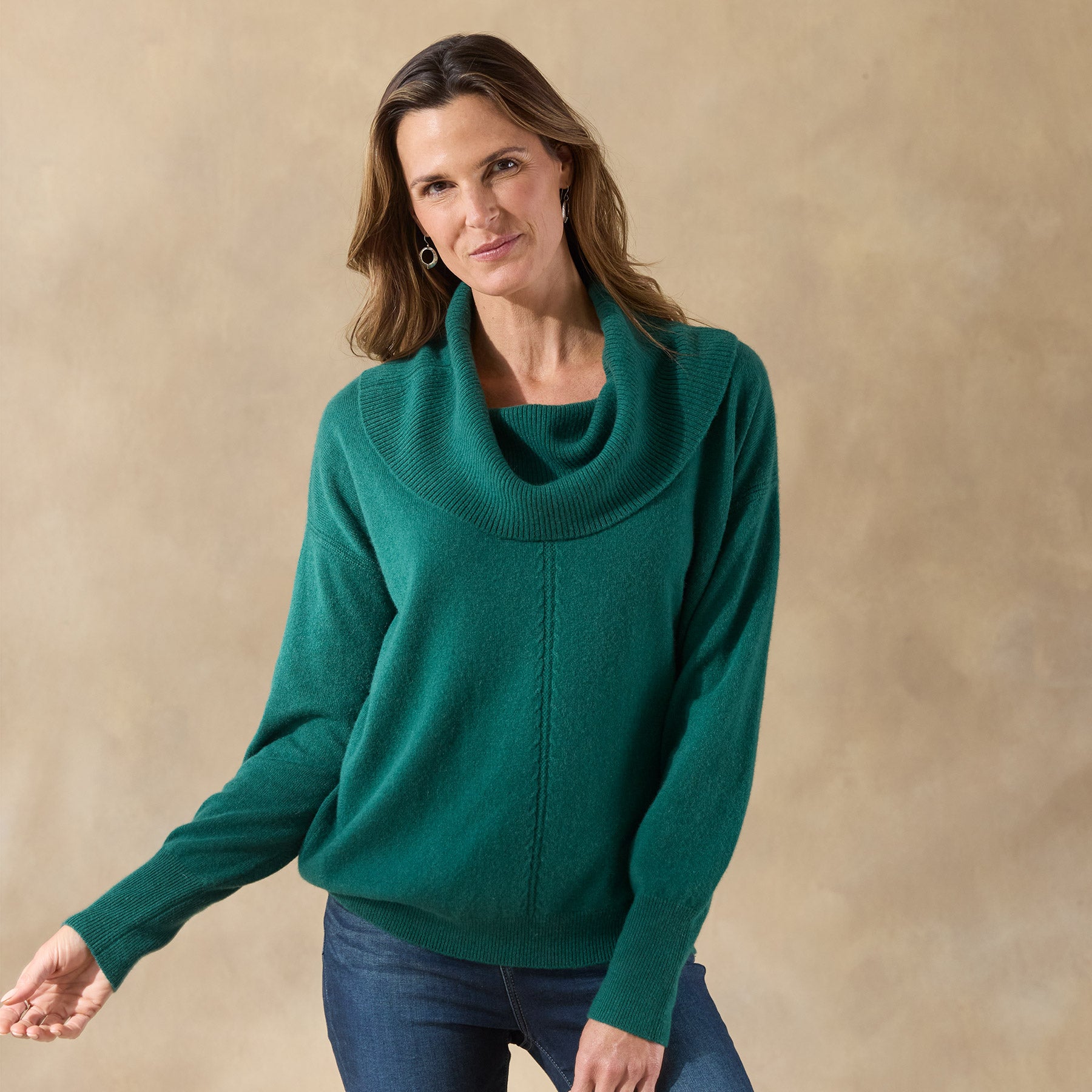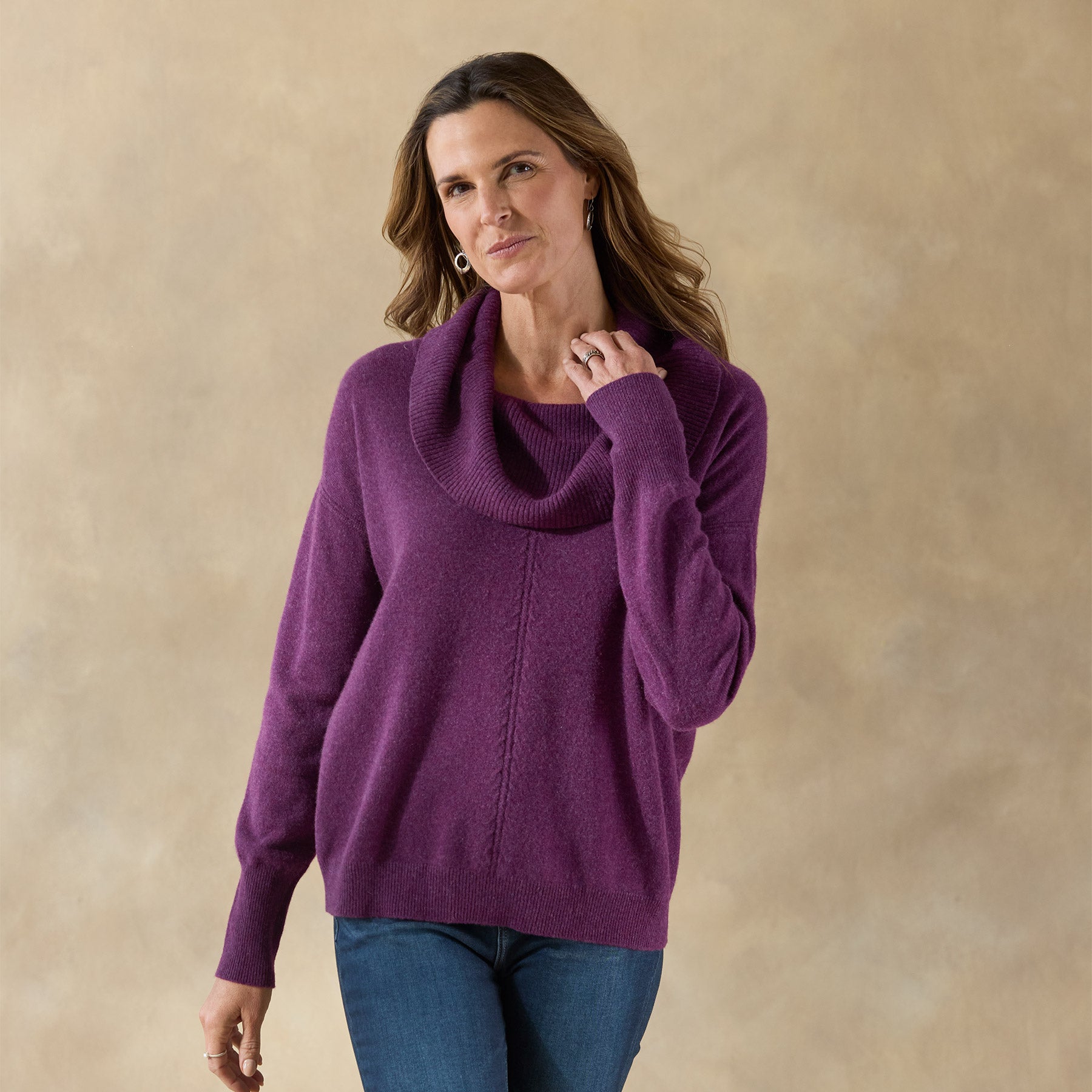 The coziest cowlneck sweater in lofty cashmere. in a flattering mixed rib with stitching center front and back and rib transfer details at arms. Easy fit. Hand wash. Imported. Exclusive. Sizes XXS (00). XS (0–2). S (4–6). M (8–10). L (12–14). XL (16–18). Approx. 22l.