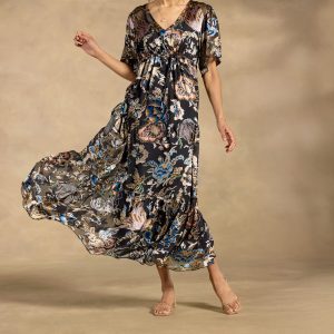 This stunning. iridescent. burnout velvet dress features a v-neck. short sleeves and tie at the waist. Slip included. Viscose/silk/polyester/spandex. Dry clean. Imported. Exclusive. Sizes XS (0?C2). S (4?C6). M (8?C10). L (12?C14). XL (16?C18). XXL (20?C22).