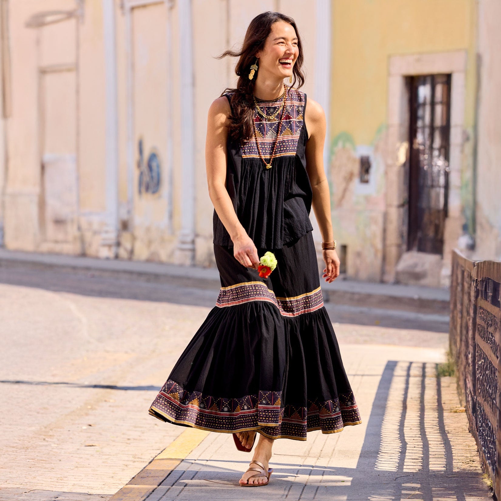 Handcrafted using traditional techniques inspired by nomadic tribes. this stunning sleeveless top has a breezy. loose-fitting body and a colorful embroidered yoke. Cotton/linen. Hand wash or dry clean. Imported. XS–XL. Approx. 25.5l.